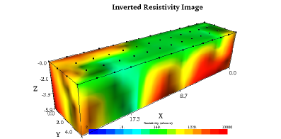 Bu Çalışma firmamız bünyesinde bulunan AGI R8 ölçüm çihazı ile yapılmıştır. Örneklerde görülebileceği gibi ölçülen alanın 3D modeli istenilen açıdan istenilen kesitlerle gözlenebilmektedir. Özellikle su emen birinlerin ve boşlukların tespitinde bire bir etkilidir. Kırmızılar yüksek elektrik direnci dolayısıyla sert birimleri, maviler düşük direnci dolayısıyla su yada metalik cevherleri temsil etmektedir.
